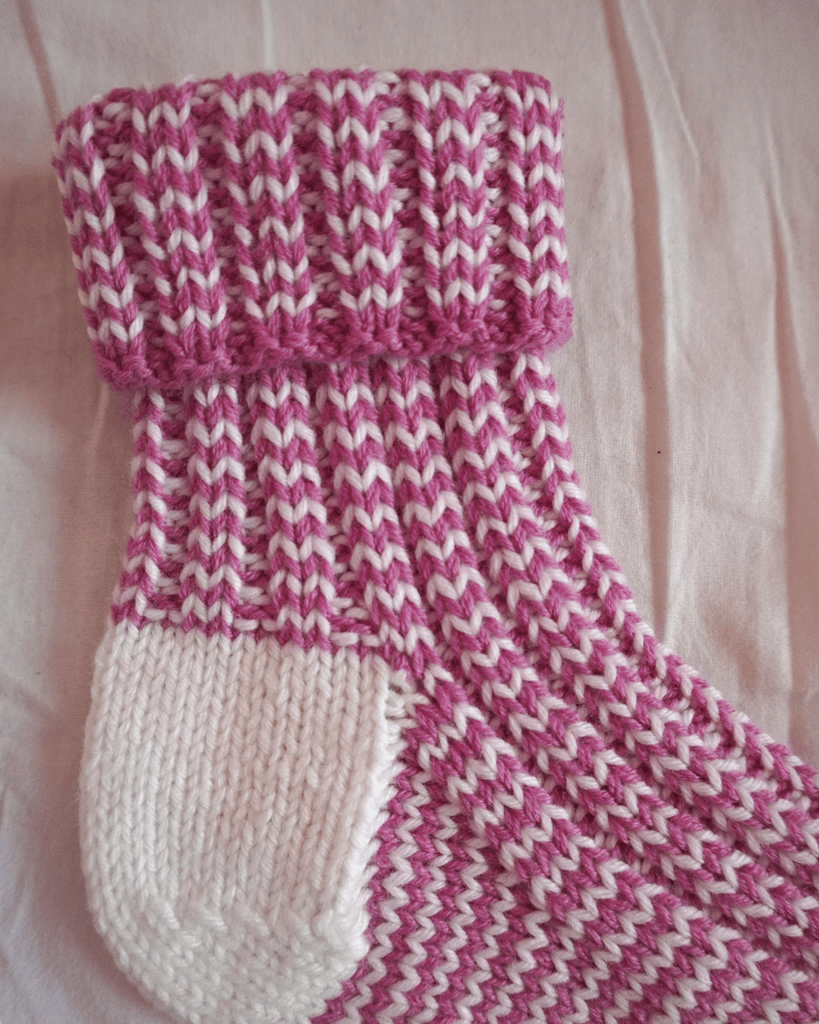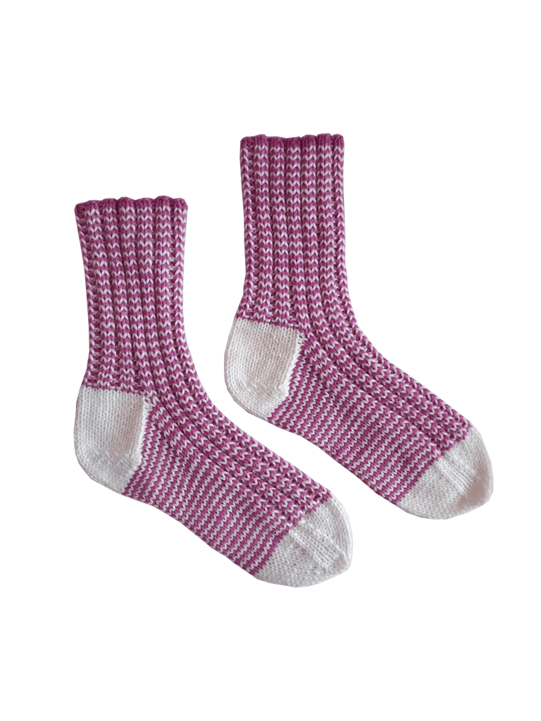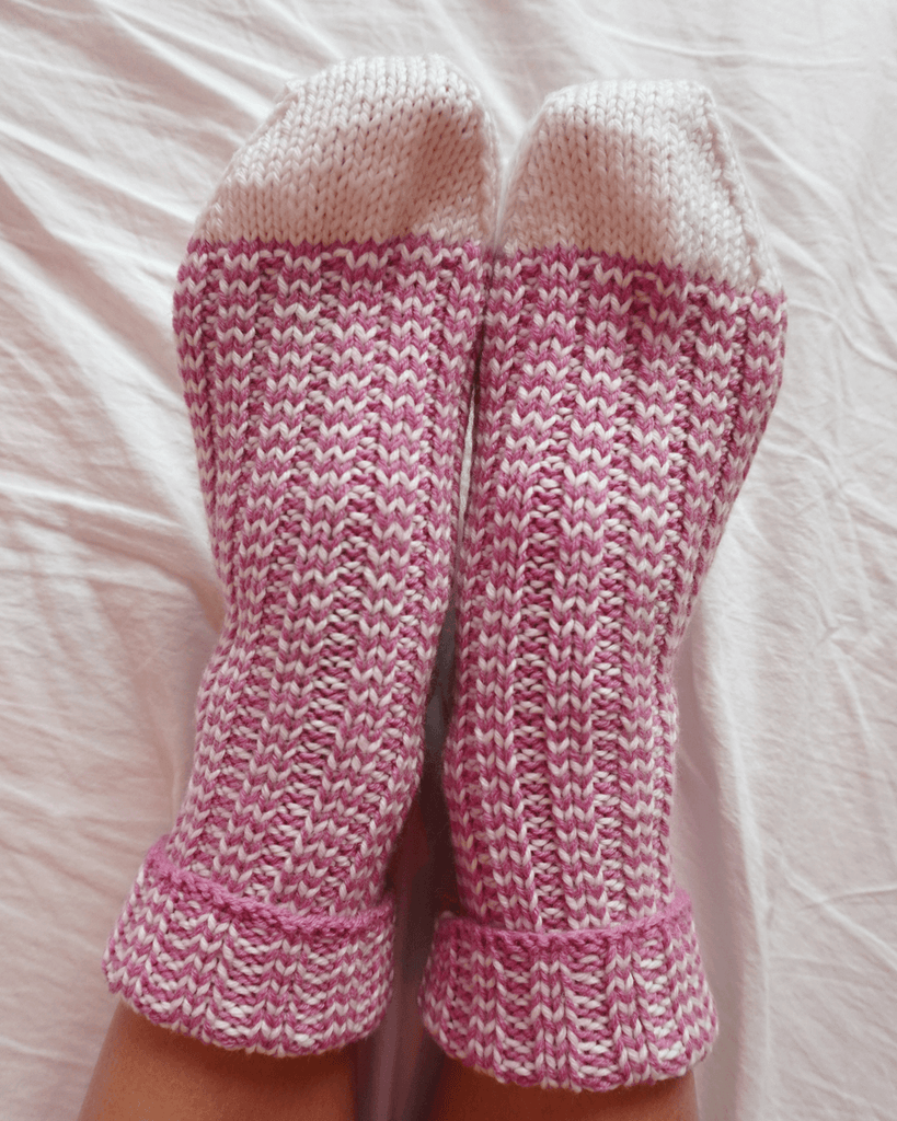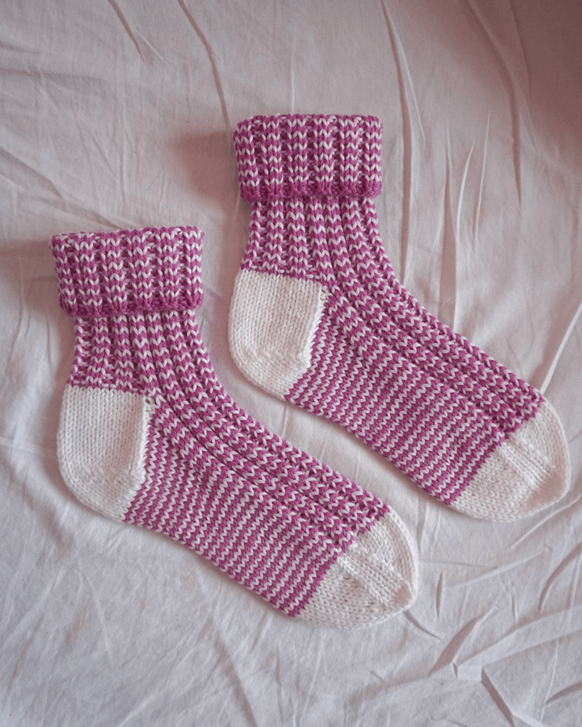 2 skeins of Double Sunday by Sandnes Garn or Pop Merino by HipKnitShop or any substitute. The pink and white socks are worked in Double Sunday by Sandnes Garn in color Shocking Pink 4626 and Pop by HipKnitShop in color Marshmallow.