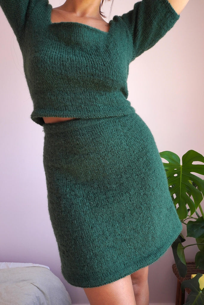 Sizes 0 (1) 2 (3) 4 are designed to fit a waist circumference of 58-63 (64-68) 69-74 (75-79) 80-85 cm [22¾-24¾ (25¼-26¾) 27¼-29¼ (29½-31) 31½-33½ inches] and a hips circumference of 86-91 (92-97) 98-102 (103-108) 109-114 cm [33¾-35¾ (36¼-38¼) 38½-40¼ (40½-42½) 43-44¾ inches]. For reference, the green skirt in the photo was knitted in size 2.